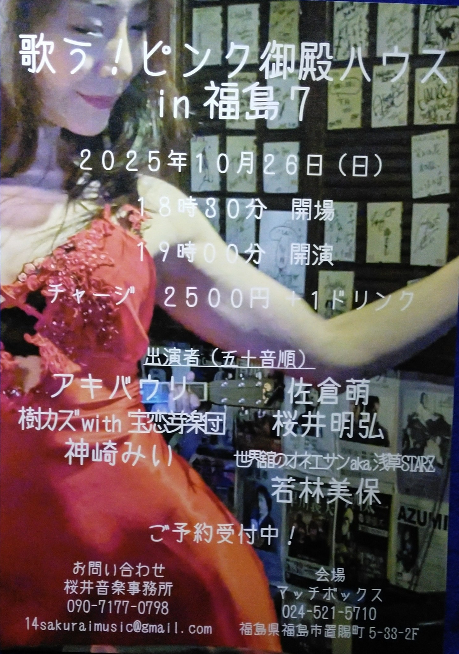 『歌う!ピンク御殿ハウスin福島7』 出演 アキバウリ 樹カズwith宝恋芽楽団 神崎みい 佐倉萌 桜井明弘 世界館のオネエサンaka浅草STARZ 若林美保 お問い合わせ ...